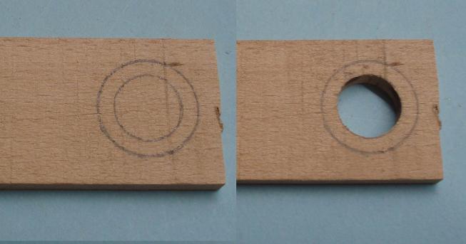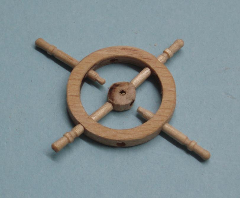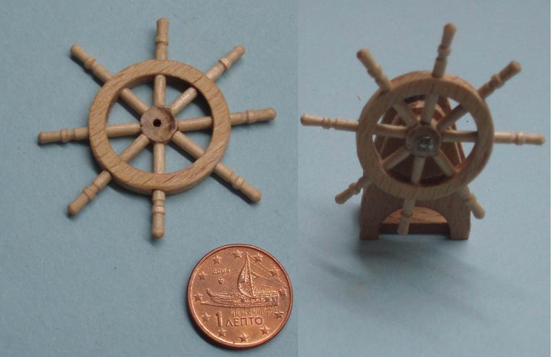 2. Τοποθετούμε την ροδέλα σε ένα κυλινδρικό ξύλο πάνω στο οποίο έχουμε σημειώσει τις ακτίνες του τιμονιού και τρυπάμε την ροδέλα στα αντίστοιχα σημεία (8 συνολικά) με τρυπάνι κοντά στο πάχος οδοντογλυφίδας.Αφαιρούμε το ξύλο από τον εσωτερικό κύκλο (ξεκινώντας από μία τρύπα) και στη συνέχεια κόβουμε από το ξύλο τον εξωτερικό κύκλο.