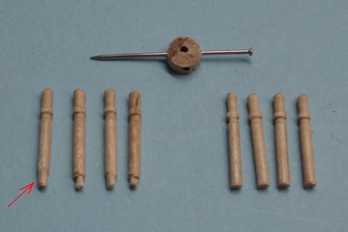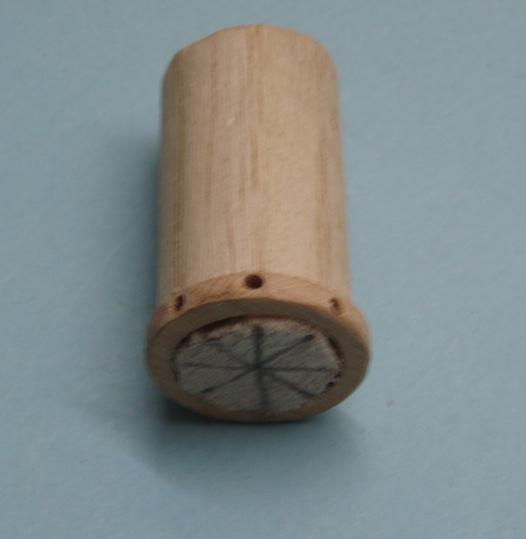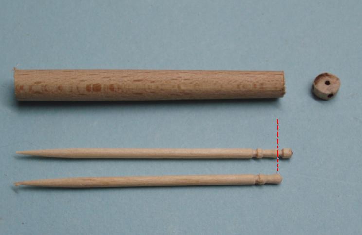 4.Κόβουμε τις 4 από τις διαμορφωμένες στο μήκος των ακτίνων του τιμονιού και τις άλλες 4 λίγο μακρύτερες και λεπταίνουμε τα κάτω άκρα τους.3.Από έναν μικρό ξύλινο κύλινδρο κόβουμε μία «φέτα» και ανοίγουμε 4 τρύπες σταυρωτά και μικρότερες από το πάχος οδοντογλυφίδας. Ακόμη παίρνουμε 8 οδοντογλυφίδες (όπως τις συγκεκριμένες της φωτο) και τις διαμορφώνουμε (κόβοντας λίγο από το ένα άκρο τους) όπως φαίνεται στη φωτογραφία.