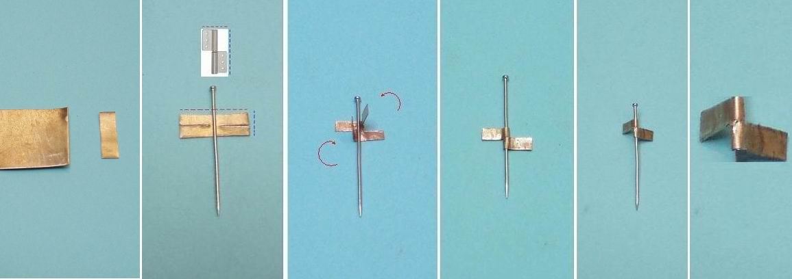 1. Από ένα κομμάτι λεπτό και μαλακό μέταλλο (π.χ. φύλλο χαλκού) κόβουμε μικρότερα ίδια κομμάτια και στον μισό αριθμό των μεντεσέδων που χρειαζόμαστε (πχ αν για μια πόρτα χρειαζόμαστε 4 θα κόψουμε 2) . Προσέχουμε οι διαστάσεις κάθε κομματιού να είναι ίσες προς το διπλάσιο μέγεθος κάθε μεντεσέ. (βλ. παρακάτω φωτογραφία).