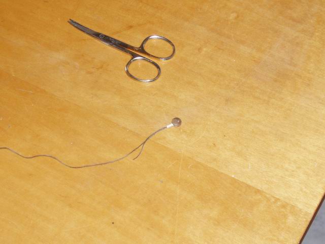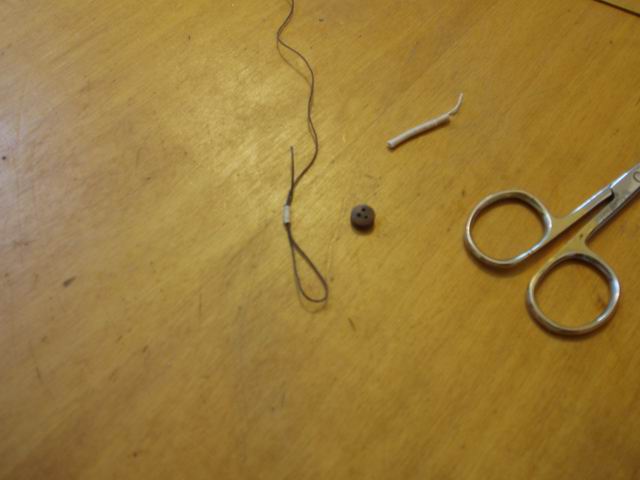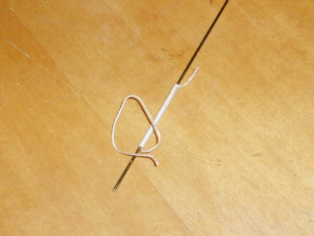 1. Παίρνουμε σύρμα ή πετονιά στην διάμετρο που μας ενδιαφέρει και τυλίγουμε γύρω του κλωστή για όσο μήκος θέλουμε να έχουν συνολικά όλα τα φιμώματα που θα φτιάξουμε. Στη συνέχεια την καλύπτουμε με κόλλα για ξύλα. (βλ. παρακάτω φωτογραφία)