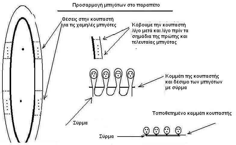 1.Όταν είμαστε στο στάδιο που περνάμε την κουπαστή στο μοντέλο στα σημεία που θα πρέπει να περάσουμε τις μπιγότες, Α (αν περνάμε την κουπαστή μονοκόμματη) κόβουμε ένα κομμάτι της λίγο μεγαλύτερο από το πλάτος του συνόλου των μπιγότων ή Β (αν την περνάμε κομματιαστά) σχεδιάζουμε και φτιάχνουμε αλλά δεν κολλάμε το συγκεκριμένο κομμάτι.