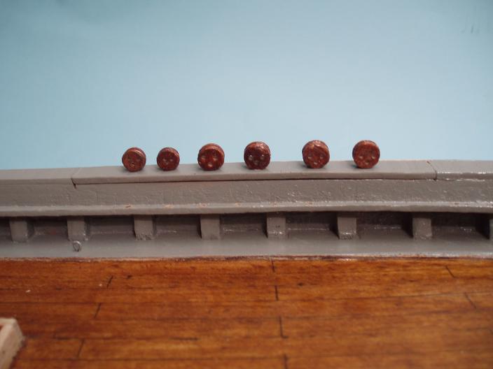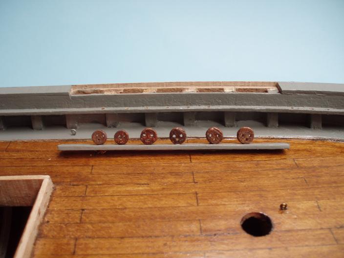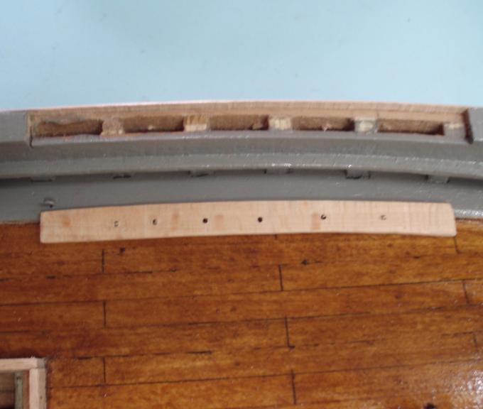 2.Πάνω στο κομμάτι αυτό ανοίγουμε τρύπες και αφού το βάψουμε (στο χρώμα και της υπόλοιπης κουπαστής, όταν έλθει η ώρα του.) προσαρμόζουμε τις μπιγότες με περαστό σύρμα μέσα-έξω.