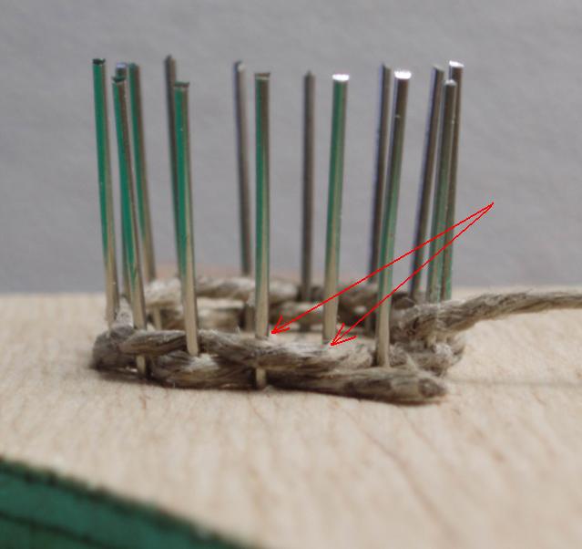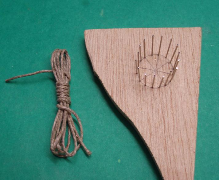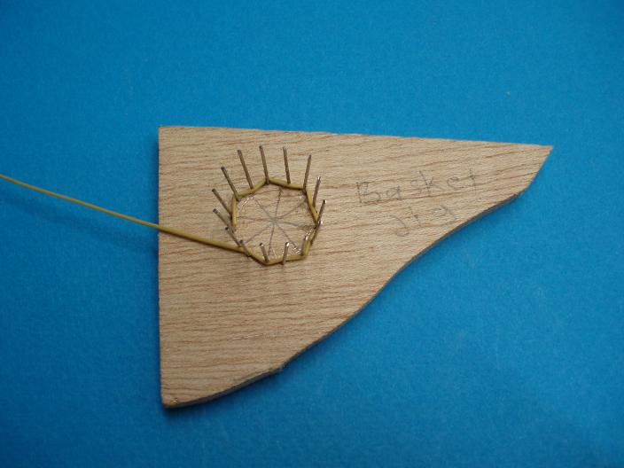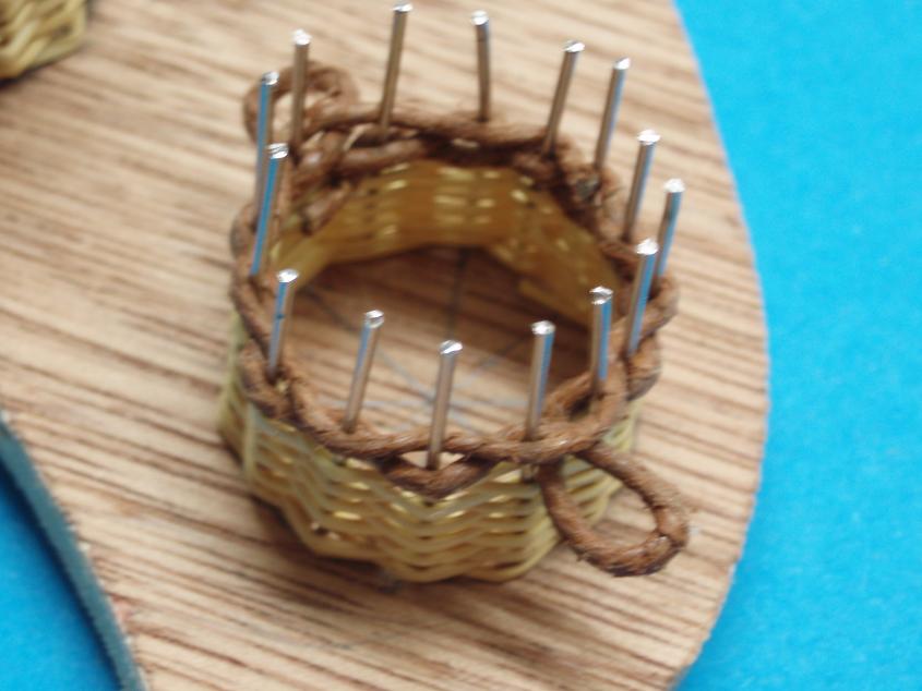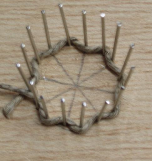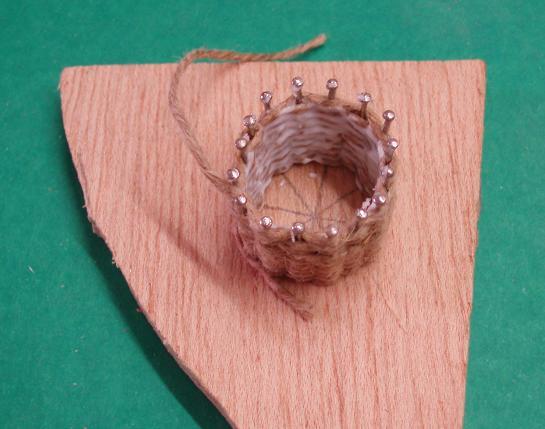 Σε ένα κομμάτι μαλακό ξύλο σχεδιάζουμε ένα κύκλο με διάμετρο όσο το καλάθι που θέλουμε να φτιάξουμε. Ξεκινώντας από ένα σταυρό (και κλέβοντας λίγο) καρφώνουμε καρφίτσες χωρίς κεφάλι, γύρω στην περίμετρο του κύκλου και σε ΠΕΡΙΤΤΟ αριθμό (17-19) εξαρτώμενο από την διάμετρο.