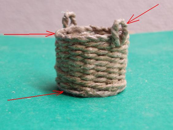4.Με μικρά κομμάτια του ίδιου κορδονιού κολλάμε και δύο χειρολαβές στο άλλο άκρο του καλαθιού. Βλέπε παρακάτω φωτογραφίες.